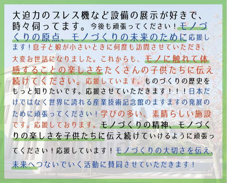 「ものづくりの大切さを 次世代に広く伝えてください。繊維機械から自動車製造 過去・現代・未来につなげること 期待しています。」