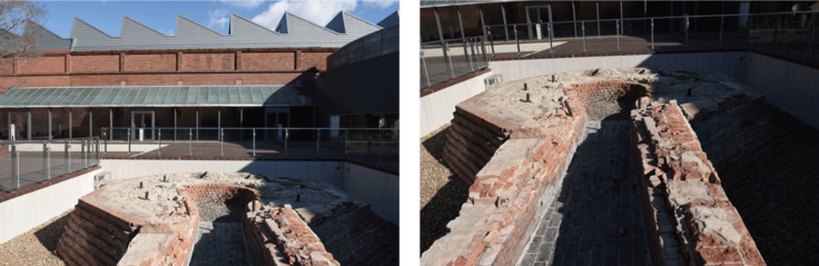 「動力の庭」に残る煉瓦壁は1914年の紡績工場拡張時のもので、館内で最も古い煉瓦壁です。