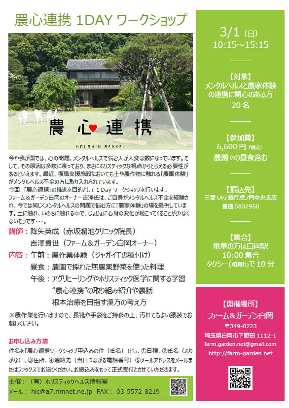 応援メッセージ③でご登場いただきました、赤坂溜池クリニック院長の降矢英成先生が関わられているホリスティックヘルス情報室主催のイベントが、ここファーム&ガーデン白岡で開催されます。