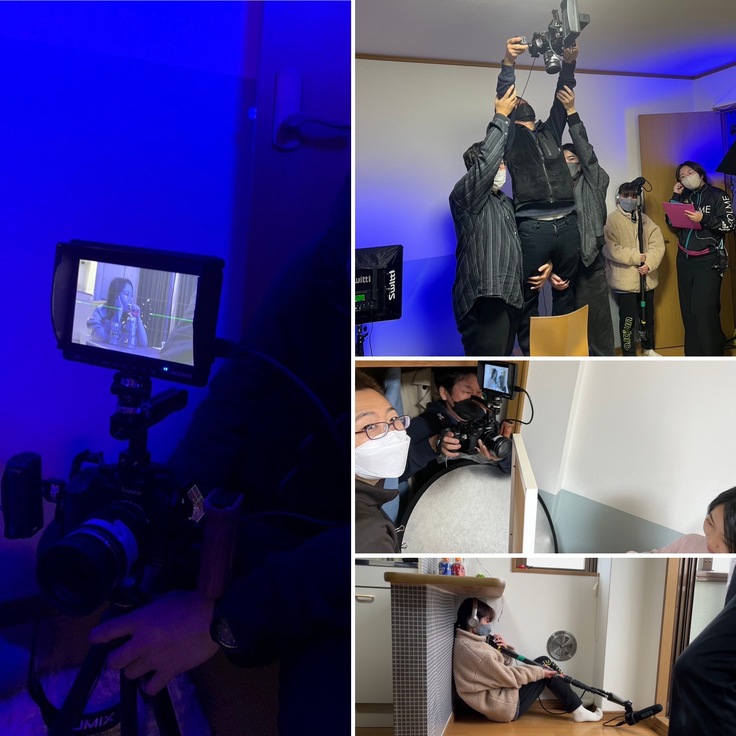 夜、たった一人、ポツンと残されたその子がお酒を飲んで・・・というシーン(左の青い写真の画面の中)の裏には、こんなに(そして他にも3、4人)スタッフがいるのでした。