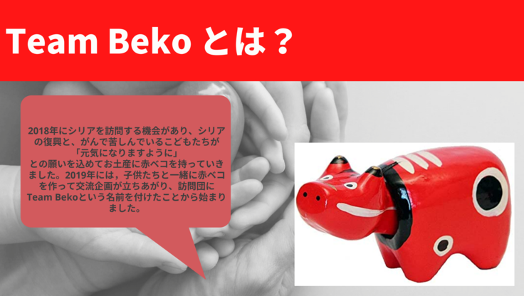 2018年にシリアを訪問する機会があり、シリアの復興と、がんで苦しんでいるこどもたちが元気になりますようにとの願いを込めてお土産に赤ベコを持っていきました。2019年には,子供たちと一緒に赤ベコを作って交流企画が立ちあがり、訪問団にTeam Bekoという名前を付けたことから始まりました。