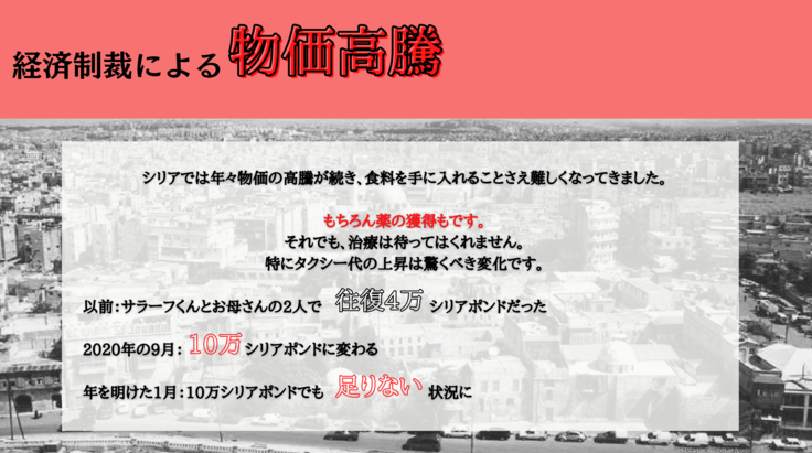 タクシーは通院手段なので必要不可欠なのですが、元々サラーフ君とお母さんの2人で往復4万シリアポンドだったのが2020年の9月には10万シリアポンドに変わり、年を明けた1月には10万シリアポンドでも足りない状況に陥りました。