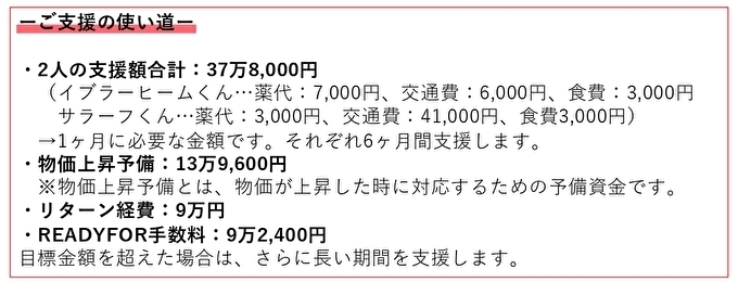 今回のクラウドファンディングでは、イブラーヒーム君とサラーフ君の薬代・交通費・食費を6ヶ月間支援します。