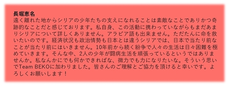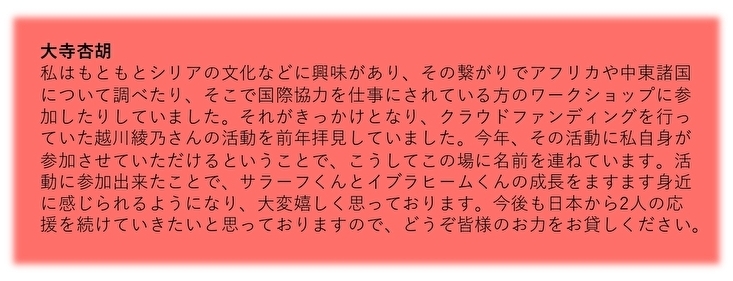 それでも、この活動をきっかけにシリアで頑張る少年がいること、私たちと一緒に応援ができることを知っていただけたら幸いです。