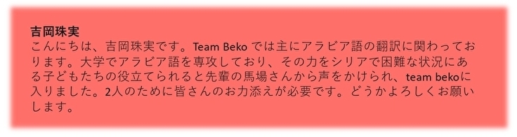 Team Bekoは、福島県の会津地方に伝わる伝統玩具の赤べこを世界に広げ平和を作っていくことを目指す団体です。 赤べこが、原発事故が起きた福島と、紛争が起きているシリアを結ぶ「平和の架け橋」になるよう活動しています。