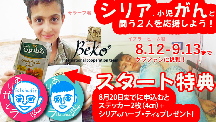 スタート特典を今回お付けすることになりました!最初の一週間 8月20日までにクラファンで募金してくださった方にもれなくステッカーとシリアのハーブティを一袋お付けします。