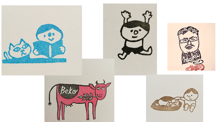 ステッカーの説明 このステッカーは、消しゴムハンコ作家の岩崎美那子さんが昨年作ってくれた二人の似顔絵スタンプをデザインしたものです。昨年はTシャツも作り好評でした。岩崎さんの作品はとってもほっこりします。