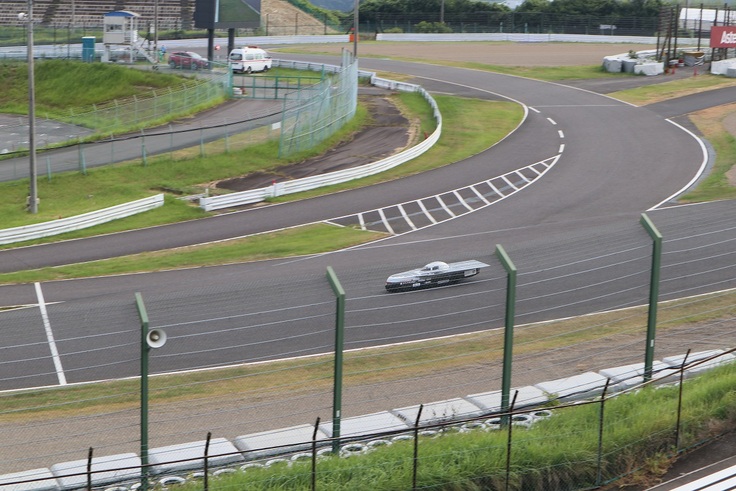 集団の中でひときわ小さな我々のマシンは、前大会まで4時間耐久エンジョイクラスで使用していたマシンを作り替えたもの。当時のコンセプトにより全幅の小さい「いも虫型」マシン。トレッド幅の狭いマシンはコーナーの安定性に欠ける。肝心のソーラーパネルの面積も限られ、太陽電池面積は3㎡と極端に少ないため、他チーム車両ほどの発電は期待できない。車体のコーナーリング安定性と発電量は厳しいものの、車体が細く小さいことで空気抵抗は小さく軽い。低い消費電力で周回を重ねることができる・・・。太陽光による発電量があまり期待できない今回のコンディション「曇天」は、我々にとって「追い風」となりました。