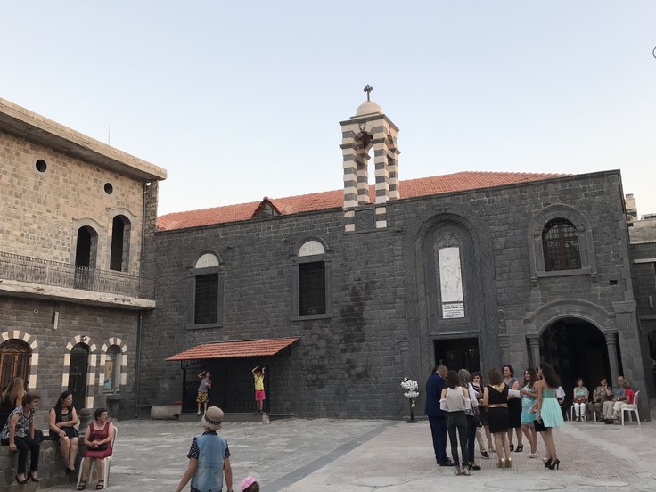 え、シリアなのにキリスト教?と疑問を抱かれませんか。私も最初は中東=イスラームと思っていました。ですが、中東は宗教の揺籃の地であり、多文化社会。シリア中部のホムス(ヒムス)でもイスラーム教のモスクの隣にキリスト教の教会(写真②)があります。教会が皆の憩いの場となります。