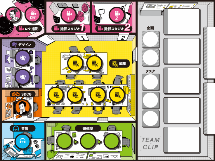 CLIP社のオフィス内では、制作に必要な「撮影」「デザイン」「編集」など様々な業務を行うことができます。ミッションをクリアするためには、これらを上手く捌いていくことが求められます。
