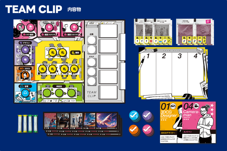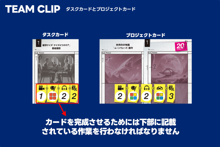 作業には様々な種類があり、それぞれ行うべきアクションが存在します。それらのアクションが完了すると、カードに完了した目印を置くことができます。これを繰り返し、編集作業まで終えると無事納品が完了します。