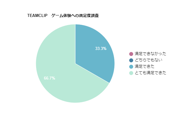 続けて、TEAM CLIPをプレイしていただいた上で純粋にゲームとして満足できたかどうかを調査した設問です。「満足できた」以上のご評価をいただいた方は100%、その中でも最高評価である「とても満足できた」は全体の66.7%となりました。先ほどの研修全体の評価とほぼ同じ結果であることから学習内容への満足度に加えて、単純にゲーム自体も楽しんでいただけたことがわかる調査結果になっているのではないかと考えられます。
