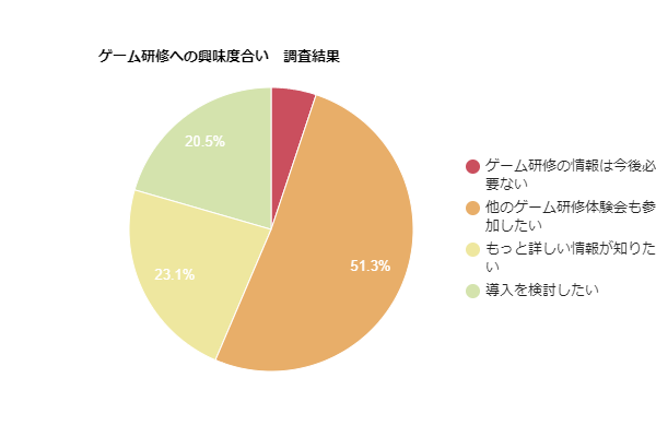 このアンケート調査はゲームのプレイだけではなく、前後の座学研修を含めた評価となっており学習実感を含めた体験においても十分にご満足いただけたことを表す数値になっていると考えられます。