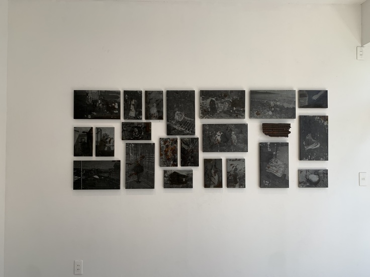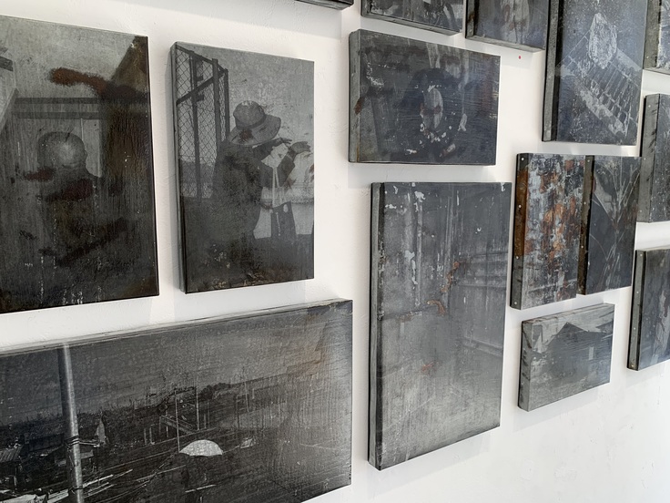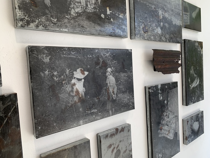 今回の展示はただの写真ではなく、トタン板に鯖を入れ、その錆びた板に写真を転写しています。潮に洗われた色褪せた島の様子を表現するという、写真家の木村肇さんのアイデアです。