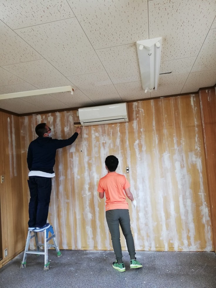 この部屋は古ぼけた木の壁です。明るい色のクロスに貼りかえるため、まずは木にあるミゾをパテで埋めていきます。