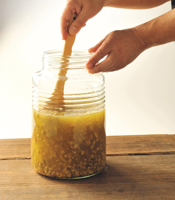 醤油麹(1kg)をほぐし、仕込み用の容器に入れ、1の食塩水を加えて醤油麹をさらにほぐしながらよくかき混ぜます。