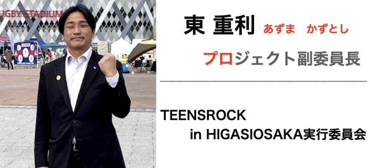 こんにちは、TEENSROCK in HIGASHIOSAKA副実行委員長の東といいます。昨年もボランティアとして参加させて頂いて今年は副実行委員長の役を承り、フェスに出られる若い勢いのある高校生の皆様とまた協力して頂けるボランティアの皆さまと共に成功させたいと思っています!ご協力の程宜しくお願いいたします。