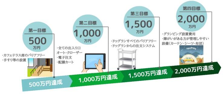 第一目標の500万ではカフェテラス席のバリアフリーや手すり等の設置までしか整備が難しくなってしまいます。障がいのある方がもっと働きやすい環境になるように設備等を整えたいと思っております。