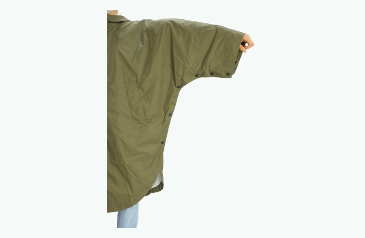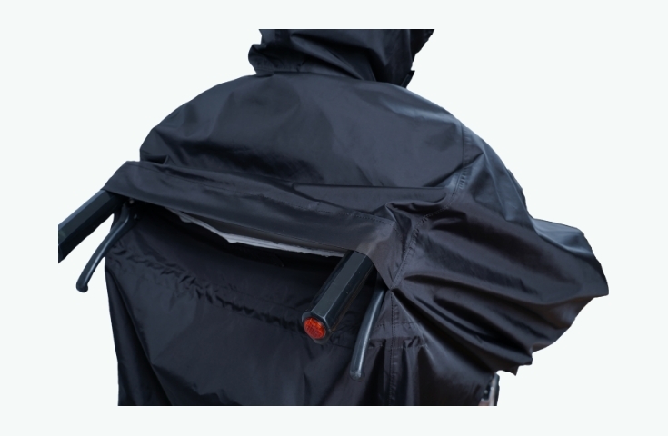 アウターの側面に付いたスナップボタンにより開き具合を調整することができるので、車椅子利用時の着用が簡単にできるだけでなく、車輪への巻き込み防止と横からの雨濡れをカバーできる設計となっております。