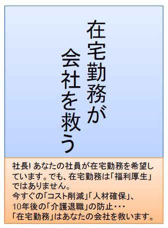 日本にテレワーク(在宅勤務も含む、場所や時間にとらわれない働き方)を15年に渡って実践、普及に努めてきた私が、在宅勤務が会社にもたらすメリットである「人材確保」「コスト削減」「事業継続」等を、経営者視点で伝える本を出版し、日本の経営者に「在宅勤務」の必要性を伝えます。
