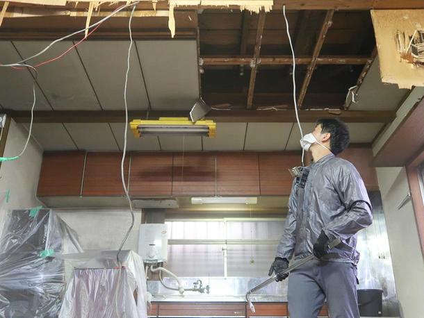 壁を壊し、台所の天井をはがし、床も一部開けて床下チェックを行っております~