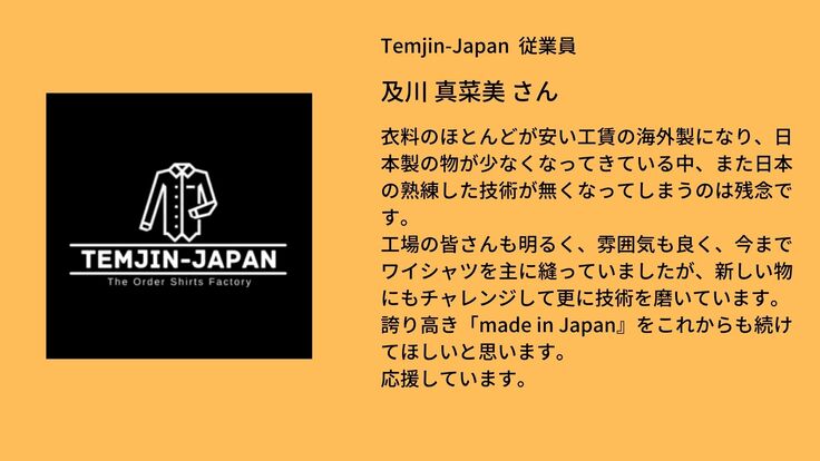 Temjin-Japanに加わって初めて岩手の工場に実際に行った時、それぞれ不安を抱えながらも、なんとかこの工場を存続させようとひたむきに作業に取り組む従業員さんたちの姿を見て強く心を打たれました。