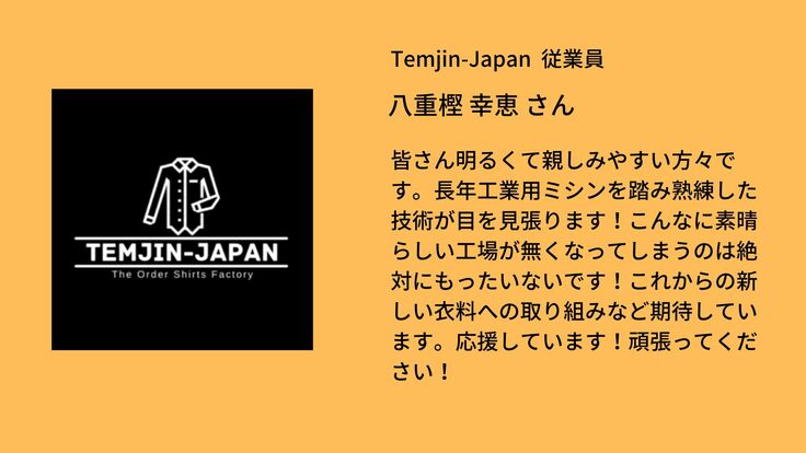 Temjin-Japanは、この旧花菱縫製の岩手・江刺工場の形態を2021年より引き継ぎ、男性用ワイシャツのオーダーメイド受注をメインに操業を再開。しかし、売上がなかなか上がらず赤字経営が進んでおり、再び閉鎖を余儀なくされる寸前です。