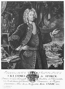 *シュポルク伯爵: František Antonin Sporck (Špork)(1662-1738)、彼は18世紀初期の中央ヨーロッパで、最も注目される文化的・知的人物の一人。彼の父は軍人で、三十年戦争で武勲を立て、フス派の亡命貴族の土地を拝領し貴族に取り立てられた、この時代の典型的な人物であった。この将軍の長子であった彼は、クトナーホラのイエズス会のギムナジウムで学んだ後、プラハのカレル大学で哲学と法律を学んだ。1680年、彼が18歳の時にヨーロッパ巡遊旅行に出て、ローマ、トリノ、南フランス、スペイン、英国、ハーグ、ブリュッセルに行き、帰国後の1682年にさらにパリにも行き、フランス文学の正確な認識を生涯に渡って得た。1684年に父の遺産を相続すると領地経営の改良と拡大に努め、1690年代初めには、宮廷の侍従長や枢密顧問官になった。
