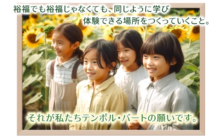 私たちは子ども達に安価な体験学習の場を作り、生活の厳しい子ども達には必要な支援をすることにより、裕福であってもなくても、同じように学び、体験することができる機会を作っていきます。