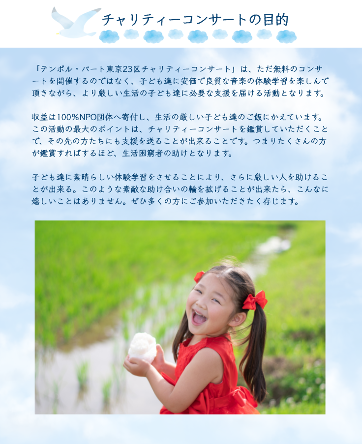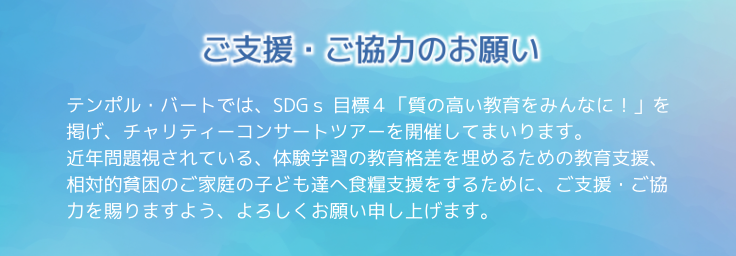 テンポル・バート楽団による夏休みチャリティーコンサートツアー。2023 8/1(Tue)・8/7(Mon)・8/15(Tue)・8/24(Thu) 全4回公演。資金はその会場費、機材運搬費、人件費(事務作業含む)、広告宣伝費として使用します。