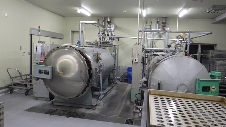 容器に詰めて蓋をしたカレーをこちらの機械に入れ、レトルト殺菌していきます。