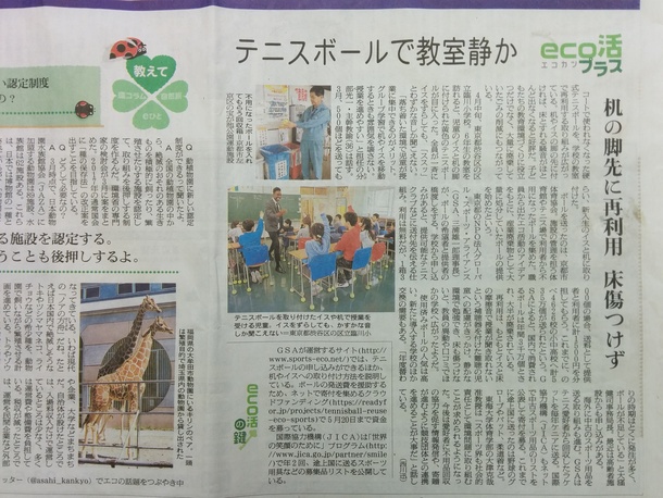 4/14 以降続発している「熊本地震」で被災された方々に心よりお見舞い申し上げます。報道で避難所になっている小学校の名前が出ていますが、熊本県は特にこの活動が拡がっている地域でほとんどの学校にテニスボールを送っているのでとても胸がいたみます。昨日の朝日新聞夕刊エコ活プラス覧にテニスボールリユース活動の様子が紹介されました。READY FOR でのプロジェクトも中間点です。記事の反響で少しでも支援の輪が広がってくれればと思っています。