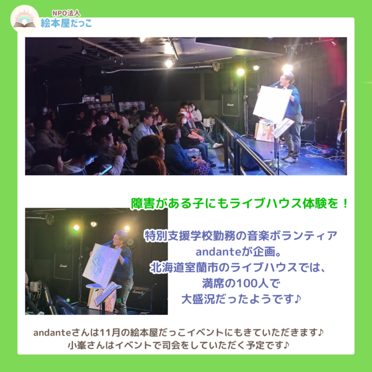 わたしたちのNPO法人「絵本屋だっこ」でも、昨年から地域でインクルーシブイベントの開催を始め、障害のある子とそうでない子が自然に交流できる機会をつくろうと努めています。
