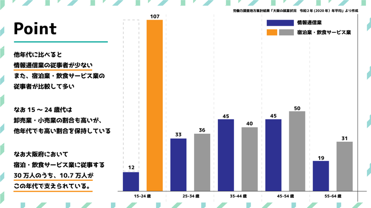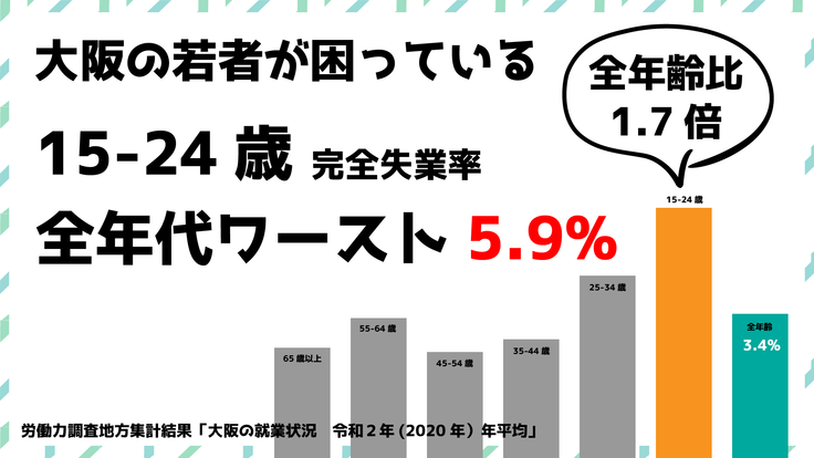 大阪府が発表する統計によると、15歳から24歳の労働者のうち5.9%、実数にして約2万7000人が「完全失業」の状態にあり、どの年代よりも若年世代の「働く」が脅かされています。