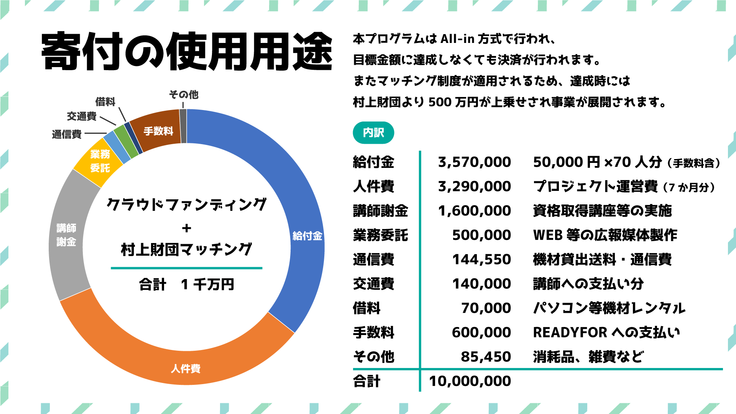 ※このプログラムはAll-in方式により、仮に目標金額に達成しなくても決済が行われます。目標金額を達成できなかった場合は、給付人数の削減とそれに伴う講師謝金、人件費等を縮小した形で事業を進めます。また、目標金額を大幅に超えた場合は、給付人数を増やし、より多くの若者を支えるように尽力します。