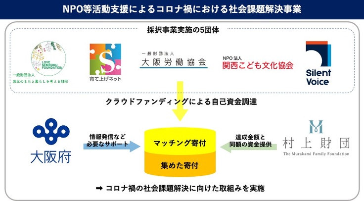このプロジェクトは大阪府の実施する「NPO等活動支援によるコロナ禍における社会課題解決事業」に採択されており、大阪府・村上財団のサポートのもと行われています。今回の目標金額500万円が達成できれば、村上財団から500万円の寄付が追加されるマッチングプログラムの対象事業です。