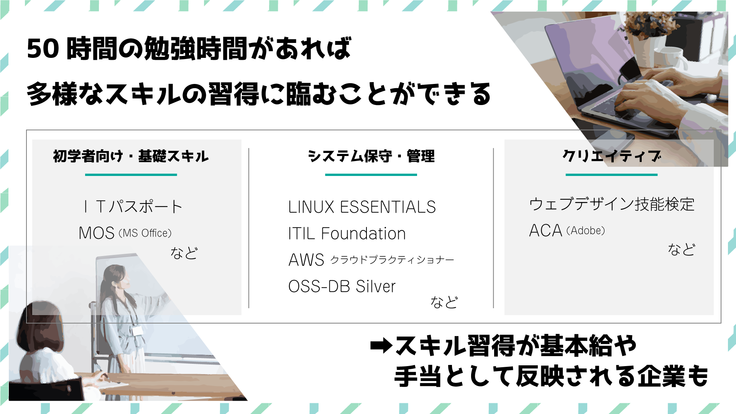 国家資格であるITパスポートの資格は学習時間は最低でも50時間といわれています。またサーバーの運用・保守に使われるOS Linuxの基礎を学ぶスキルも同様に2週間程度の学習が必要といわれています。