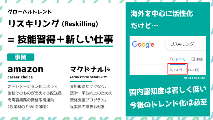 グローバルに目を向けると「リスキリング」というワードがビジネスシーンのトレンドとなっています。新しい職業に就くため、今の職場で大幅な変化に耐えていくための、職業能力の再開発を意味した言葉です。