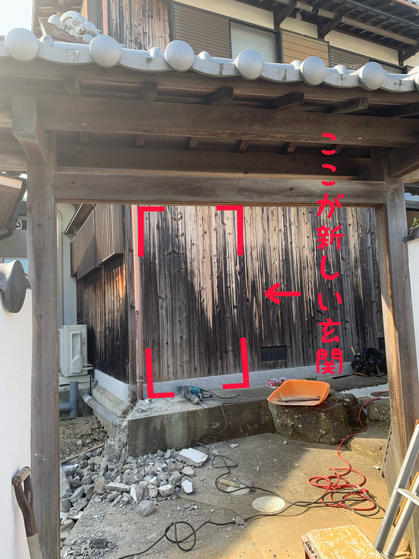 既存の古い塀(写真左)が取り壊されました!これから壁を抜いて新しい玄関を作ってもらいます。