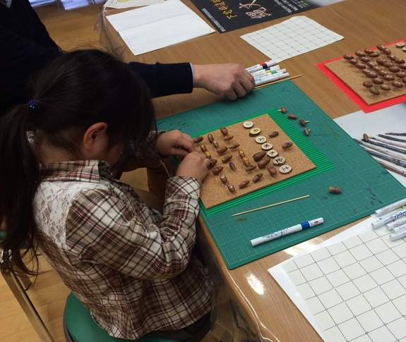 (ドングリを使ってカレンダーを作っています。)
