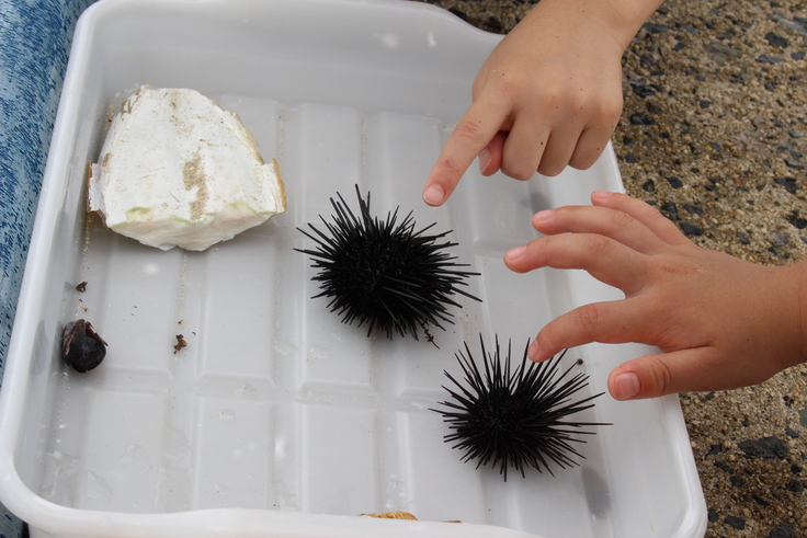 軽く運動をしたり、ハンモックで揺られたり、自由時間を楽しんだ後は、みんなで料理を作ります。夕食のメニューは事前に開催したオンラインミーティングで決めており、今年はキャンプの定番「カレーライス」です。火おこしをしておくどさん(かまど)で炊き上げたご飯に具材たっぷりのカレーを盛り、野外で食べるのは最高でした!2日目のメインは海での生き物探しです。砂浜や磯で、貝類やウニなどをたくさん発見して観察しました。たまたま打ち上げられていたフグも見つけ、無事に海に戻してあげることができました。