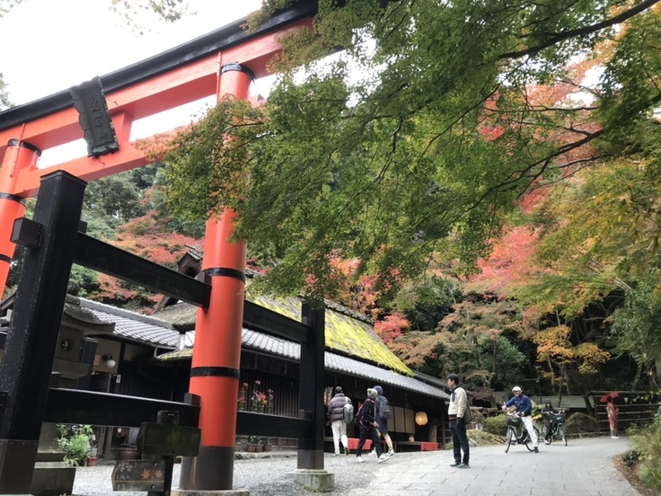 川沿いから出て道路に入り、峠を上り下りしているうちに、伝統的な建物が残る嵯峨鳥居本に到着。ここでも歴史的な町並みとあわせて紅葉を楽しむことができました。休憩できる場所まで歩いてお弁当を食べた後は、嵐山に点在するたくさんのお寺を横目に見ながらさらに歩きました。