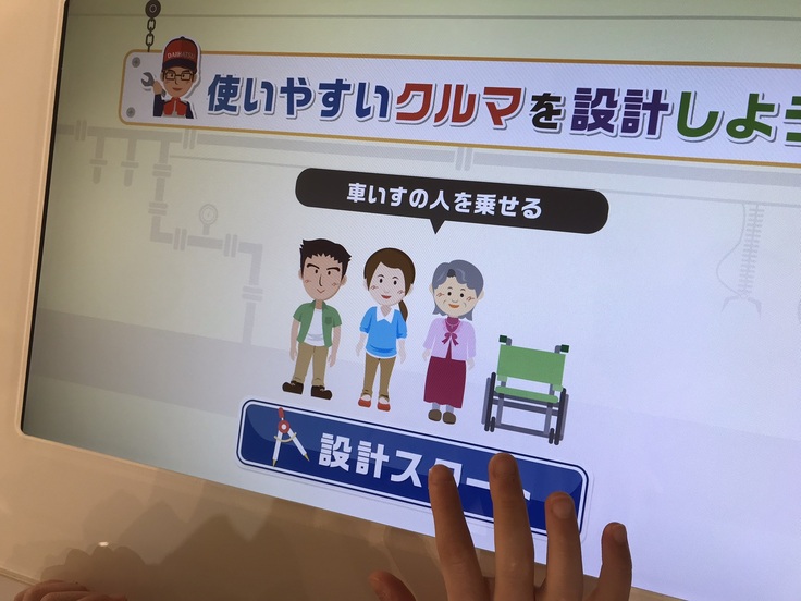 参加した小学生の子どもたちが最も熱中していたのは、4階の体験型展示の中にある「軽自動車を設計してみよう!」というコーナーでした。エンジン、燃料タンク、シートなどの種類を選んで適切な場所に配置するのですが、初めてやってみると大人にとっても意外と難しいです。「車いすの人を乗せる」といった用途に合わせて設計できると高得点になるなど、ゲーム感覚で何度も楽しめました。