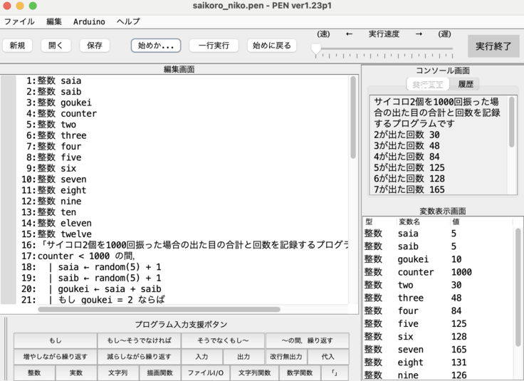 プログラミングコースでも使用しているプログラミング学習環境「PEN」(一般のプログラミング言語と違って日本語でコードを書いたり読んだりできる利点があります)を使って、1000回試行を5セット行いました。
