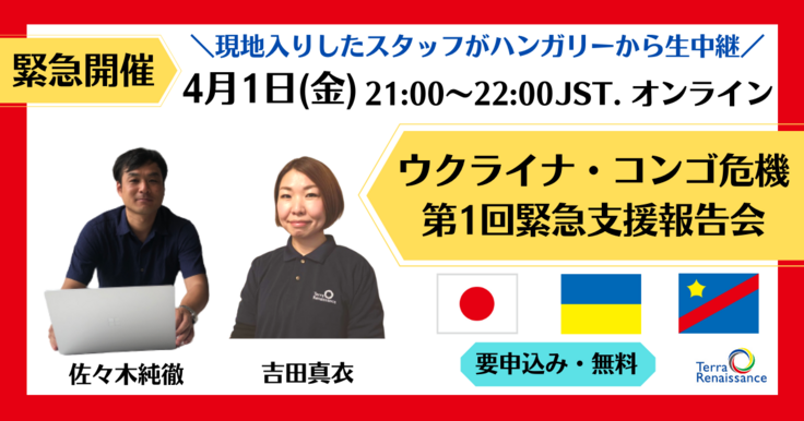 より詳細な活動報告と、今後の活動の予定についてお話しするために、「ウクライナ・コンゴ危機 第1回緊急支援報告会」を、4月1日(金) 夜9時に実施します。現地からオンラインで繋ぎ、実際に活動するスタッフからご報告します。ぜひ、ご参加ください。