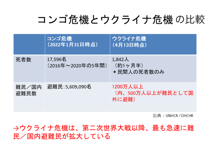 コンゴは過去5年間で死者数が1万7千人以上。難民/国内避難民の数は560万人。他方、ウクライナ危機では、難民の数が50万人、100万人、200万人、300万人、、、日に日にすごい勢いで増加していました。