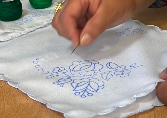 材料を持ち帰るなり、それを待っていた他のロマの高齢女性の人々は、いきなり袋を開けて、針と刺繍糸を見ながら、「懐かしい。素晴らしい刺繍糸ね!この針の穴の大きさなら私の目でも十分大丈夫!」などと口々に話していました。また、笑いながら、すごい勢いで、「こういうふうに縫えばいいのよ」と、縫い方を話し合いながら刺繍を進めていました。