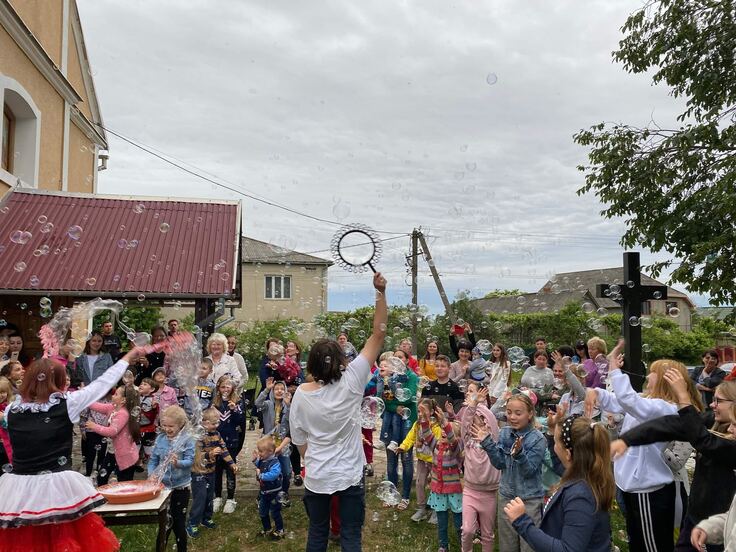(ウクライナ西部のキシュセルメンツ村に避難している難民の子どもたちに、ヨーロッパの「子どもの日」にシャボン玉パフォーマンスを行ったときの様子。難民の子どもたちも大喜び、パフォーマンスを行う難民の夫婦も大家として現金収入を得る(Cash for Contributinosの活動)支援です。)