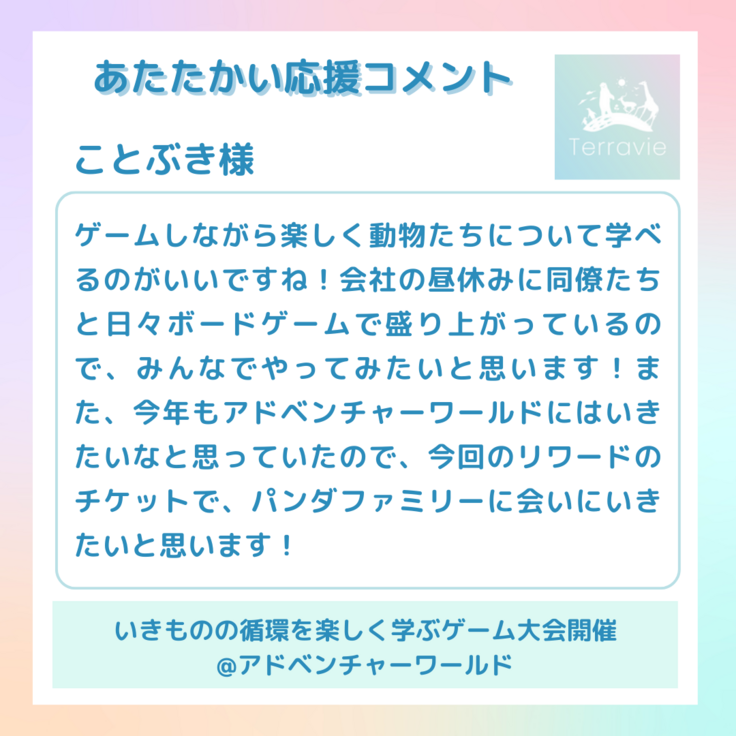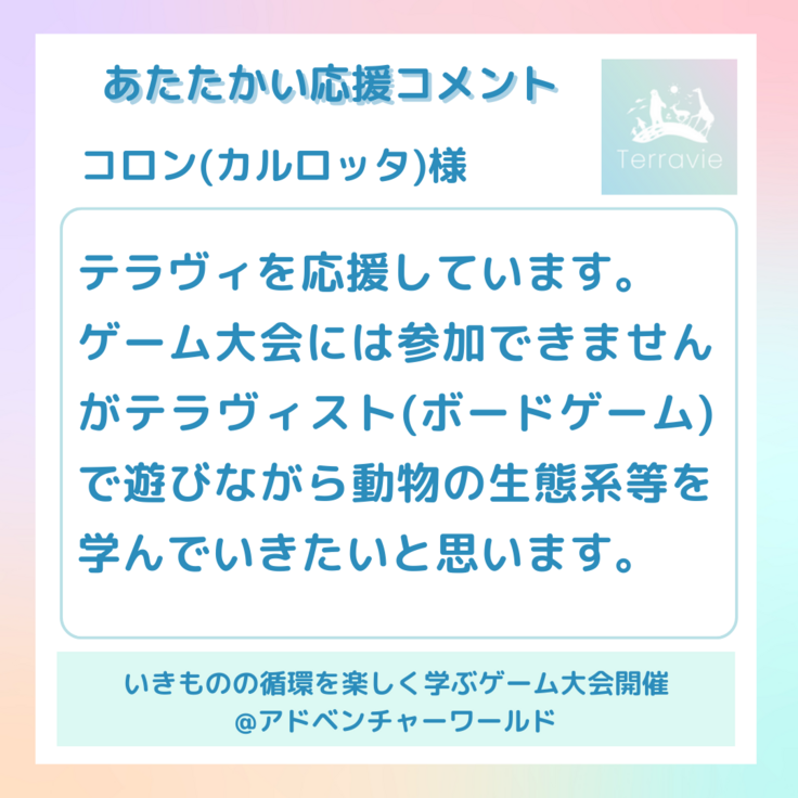 ボードゲーム「TERRAVIST」を通じて、一人でも多くの人がいきもの達に思いを馳せ、人・動物・いきものみんなを尊重できる世界になりますように。