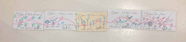 できあがったその絵に描かれていた赤い糸は、家族の繋がりそして世界中の繋がりを意味し、『世界を繋ぎたい』という彼の絵に込められた願いは、まさに古屋の願いそのものだったのです。 数日後ギャラリーを訪れた古屋とその仲間全員に、五十嵐さんは来展記念にとその場でカードに絵を描いてくださいました。そしてそのカードに描かれた赤い糸こそ仲間へと繋ぐ「絆」。古屋が五十嵐岳さんに「セネガルの子どもたちに贈る絵本の 絵を描いてもらいたい!」と思った瞬間でもありました。